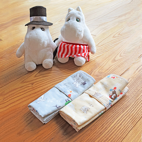 日本製の防水おむつ替えシート。肌に触れる部分は綿100%のダブルガーゼで心地よい肌触り。かわいいムーミン柄。コンパクトに畳めて外出にも便利。